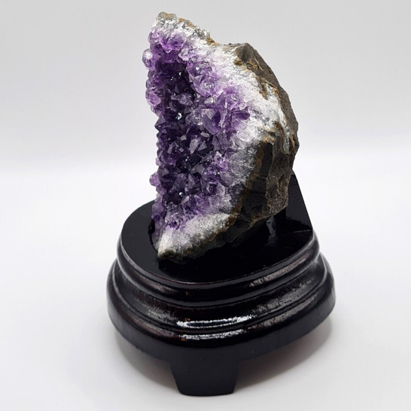 Mooie kwaliteit donkere amethist cluster inclusief op maat gemaakte houten standaard.