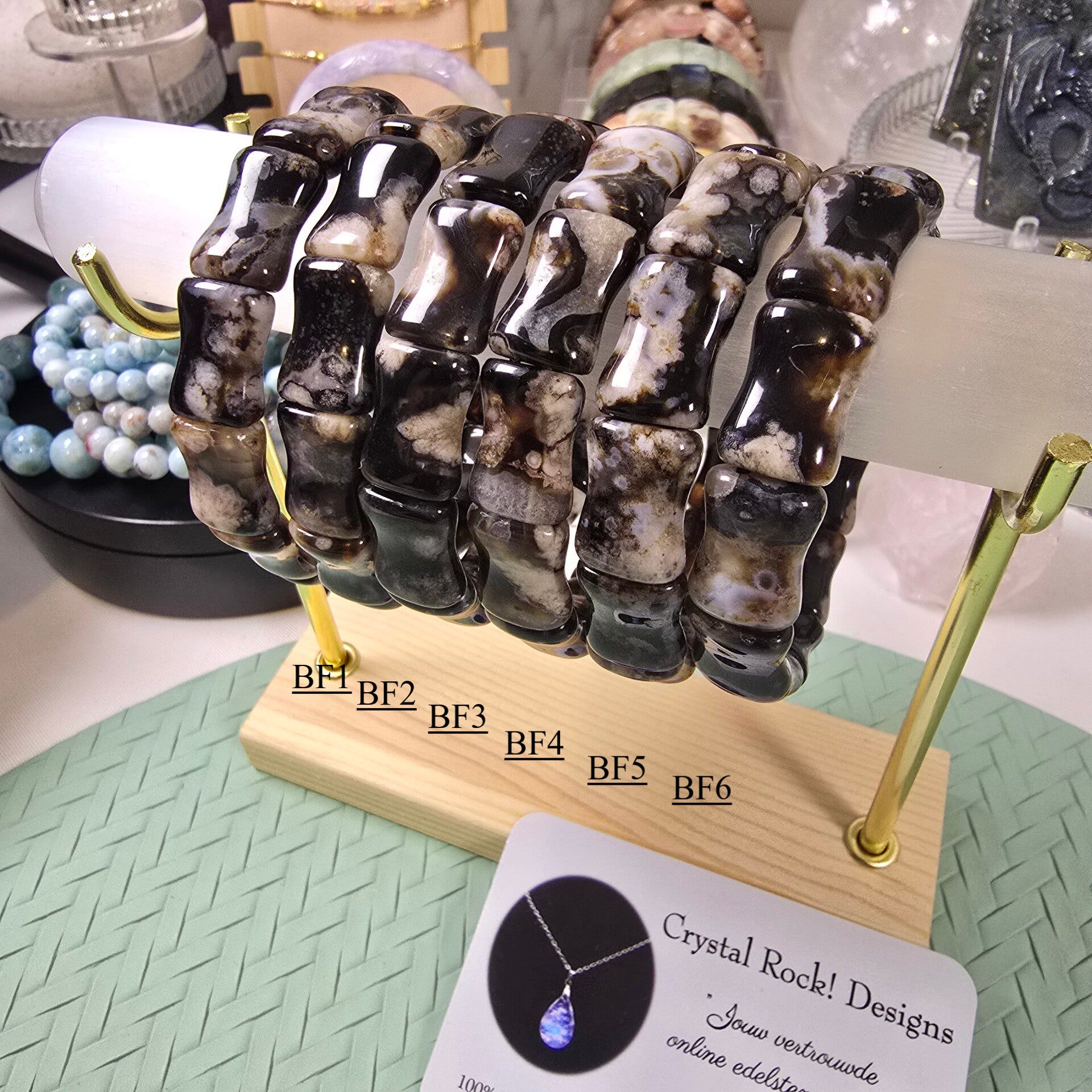 Geweldige zwarte bloemagaat armband. Vorm Bamboe. Zwart en met mooie bloemvorming erin. Sommige hebben een super mooie druzy erin.